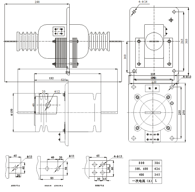 本型互感器为单匝贯穿式结构的全封闭浇注产品,二次绕组和一次绕组一起用环氧树脂脂浇注绝缘,浇注体中部有安装板,其上有铭牌,接地螺栓及四个安装孔,可供固定式开关柜中穿墙安装。